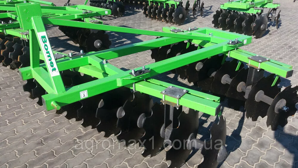 Bomet Борона дисковая 2.1 м навесная― почвообрабатывающее орудие, которое используется, чтобы разрыхлить пласты земли и измельчить крупные комья почвы. Тракторная дисковая борона предназначена для ухода за пастбищами и сенокосами, также для измельчения пожнивных остатков после уборки сельскохозяйственных культур. При влажности гарантирует эффективную работу. Крепится к навесной системе трактора.
